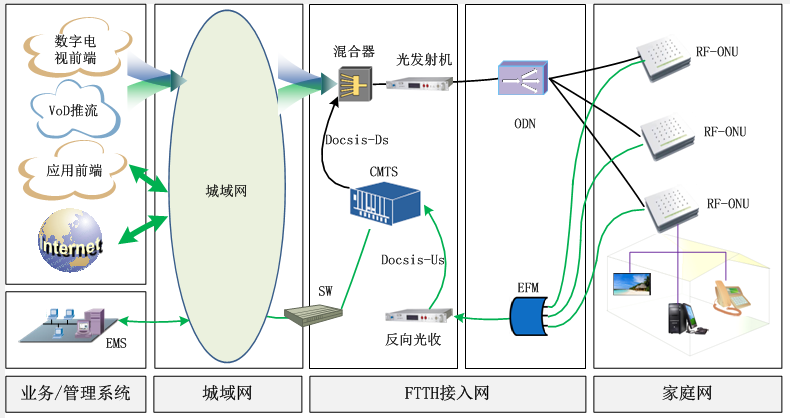 針對(duì)目前廣電FTTH網(wǎng)絡(luò)建設(shè),路通視信推出了RFoG+EFM(EdgeFreeMix)接入技術(shù)解決方案,融合國(guó)內(nèi)外應(yīng)用成熟RFoG技術(shù),實(shí)現(xiàn)基于 DOCSIS技術(shù)的FTTH接入。其中的EFM的含義是EdgeFreeMix(邊緣自由混合器),意在解決接近多個(gè)波長(zhǎng)光信號(hào)匯聚中的各種問題。使用光波控制技術(shù),將光纖分組接入后進(jìn)行二次激發(fā)達(dá)到有效避免OBI干擾的目的,同時(shí)還能解決回傳光中繼問題。